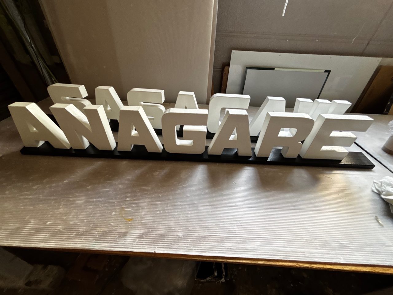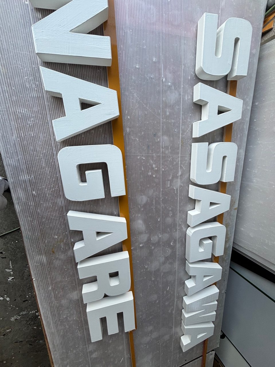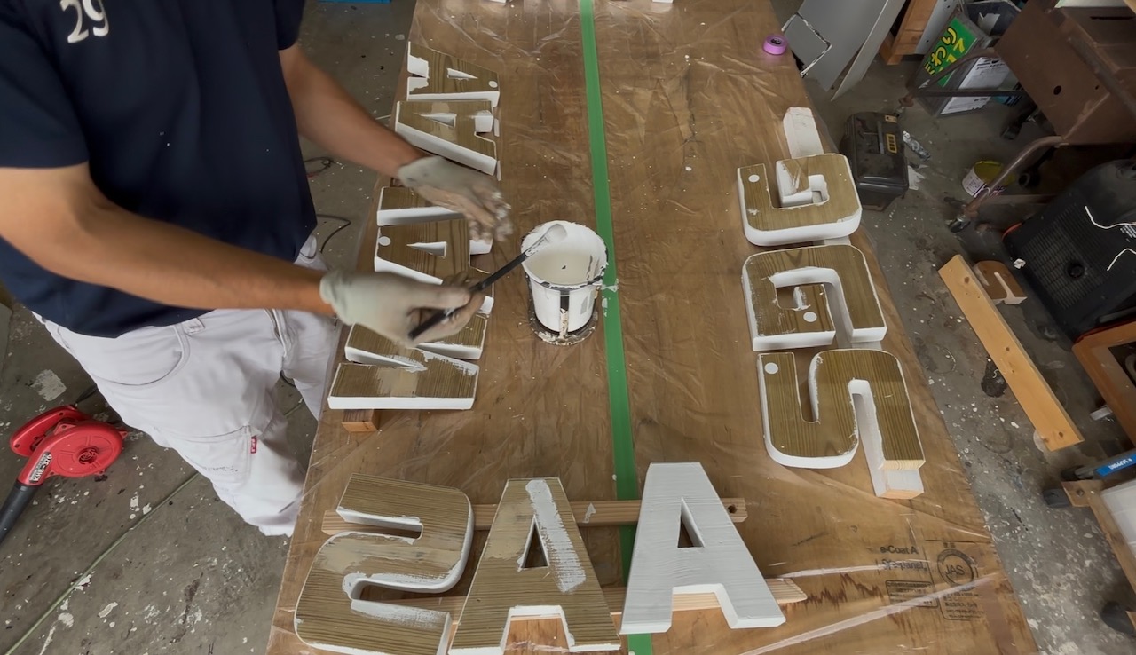 SASAGAWANAGARE 自立文字看板 立体造型文字 塗装 自立看板 施工事例 新たな笹川流れの写真撮影スポット 自立型立体文字モニュメントを製作しました。作業写真はインスタで投稿しています。 設置の日は曇っていて粟島は見えませんでした。 木材をカットして面取り作業後、下地は水性塗料塗装後にウレタン塗装をしています。 2025.07.07