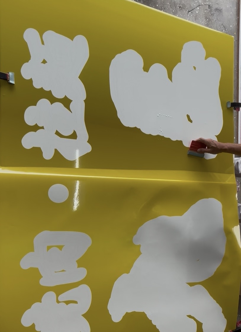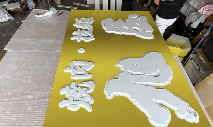 インクジェットプリントの貼りこみとカットボード(カルプ文字)の取付になります。
