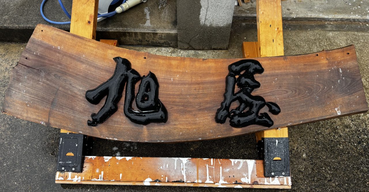 造形文字の看板 立体造型文字 塗装 施工事例 看板周りの清掃 十数年前に作った造形文字看板をリニューアル! 日焼けや雨風にさらされて汚れた木材をG-Eco工法で洗浄しました!擦ったり削ったりして地を 傷めることなく黒ずみや・カビ・汚れを除去しました! 洗浄後は店主の要望によりキシラデコールで塗装して造形文字も艶あり黒で仕上げました!木以外の看板の周りも洗浄致します! 2025.11.07
